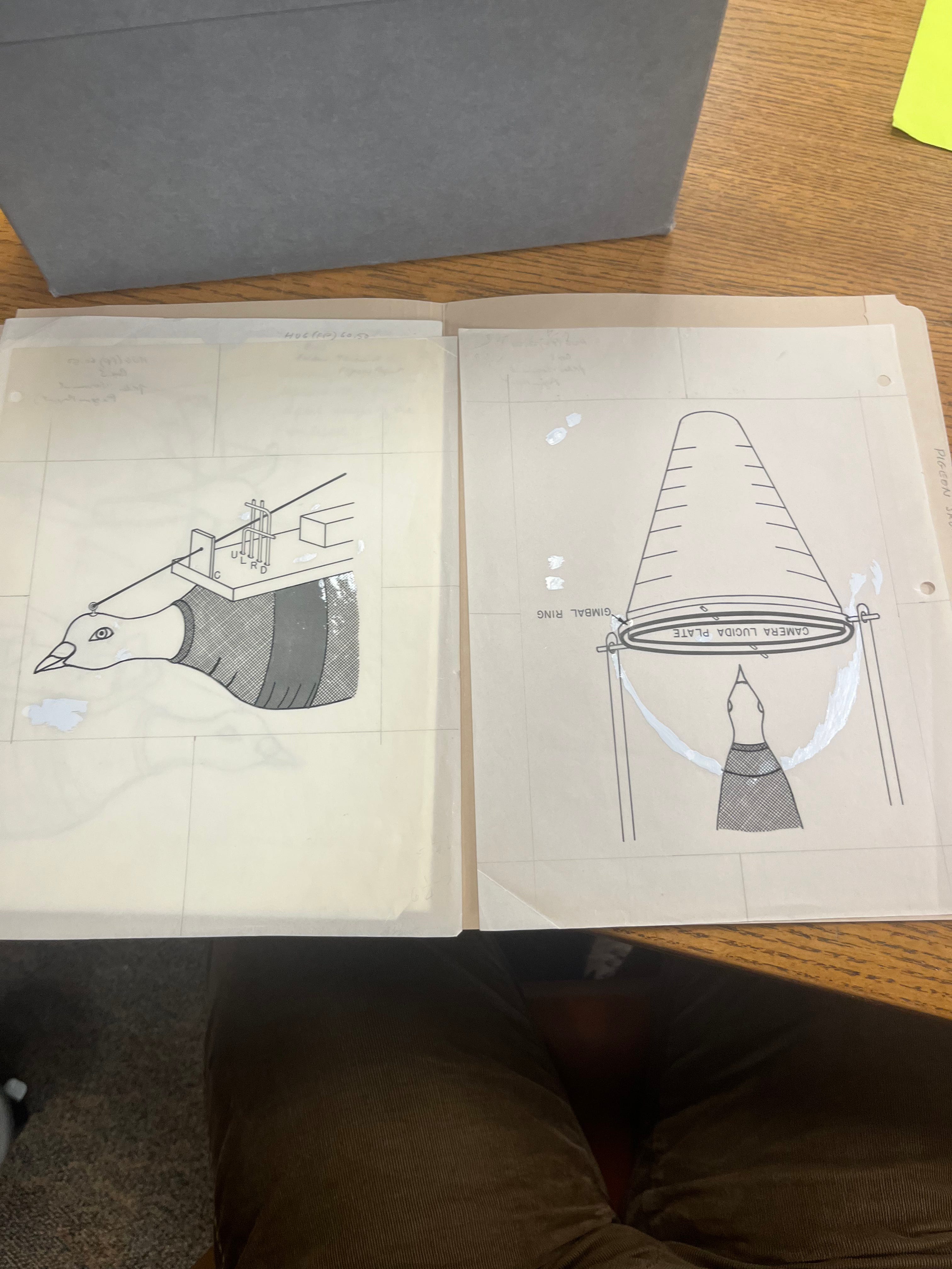 They also worked with General Mills to design a system for translating the bird’s movements into mechanical steering guidance. Marian would cut the toes off men’s socks and slide the birds into them. They tied their legs with shoestring.