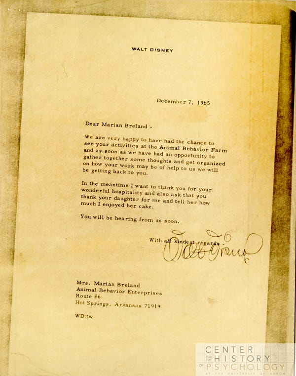 They moved to Hot Springs, Arkansas, and launched Animal Behavior Enterprises. The business used Skinner’s reinforcement ratios to train animals in commercials and theme park shows (as well as for the military). Clients included the Grand Old Opry. Sea World. Walt Disney even came by for advice on his parks.